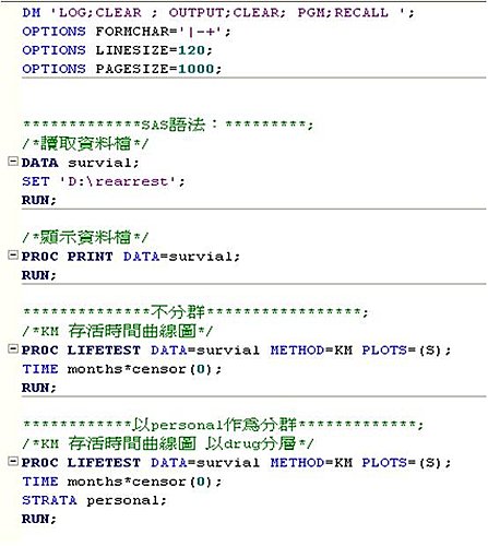 METHOD=KM PLOTS=(S); 所用的方法為Kaplan-Meier