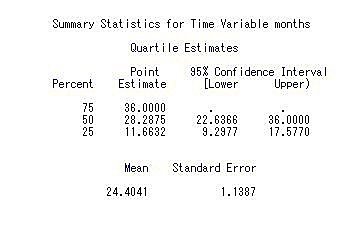由摘要表可知,在11.6632個月時,已有25%的人發生Event;在28.2875個月時,已有50%的人發生Event;在36個月時,已有75%的人發生Event。全部樣本平均存活時間為24.4041個月。