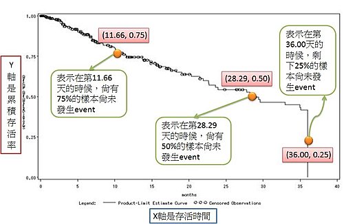 當我們有一群樣本在某一事件上的發生與否(Event or not),而且還知道持續多久的期間(Duration)才發生Event,此時我們可根據樣本此兩個依變項,畫出樣本的存活曲線(survival curves),而使用的方法為Kaplan-Meier。