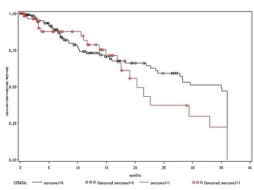(2)以personal作為分群(strata)的依據,以KM法(Kaplan-Meier)畫出兩群的S(t),以及兩群的同質性檢定(Log-rank test)。