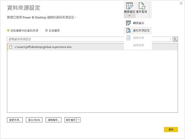 Global Superstore Dashboard提供了360度全方位商店整體銷售業績的視圖,它展示了一個跨國商店的銷售資料,分國家、城市、類別、時間等,並且有銷售額、成本及利潤額等數字。假設你正好有這類資料及需求,這個模版就可以利用。首先,從網頁中右方的「全球超市」下載Global Superstore.pbix檔。打開後,最右方可以發現它來自4張資料表。從[轉換資料]—>[資料來源設定]畫面可以得知這4張資料表來自於Global Superstore.xlsx。