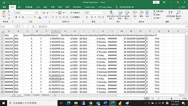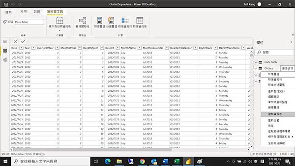 如果,模版檔同時附了excel檔,那就省事多了,將excel檔換成自己的資料即可(表頭的欄位名稱不能改)。但這個例子它沒有附excel檔,因此我們必須自己創造。先切換到資料表內容,在最右方的第一個資料表[Date Table],點選後方三個小點,選擇「複製資料表」,開一個空白的excel檔貼上,並將工作表名稱改為Date Table,其餘三個資料表比照辦理。最後儲存檔名為Global Superstore.xlsx,就完成了。